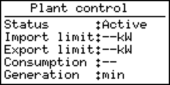 This page shows the actual plant control status. When no plant control command is currently running the status is “idle” and all items contain “–”. When a plant control command is remotely given the status becomes “active” and the given command is shown at the right item.
