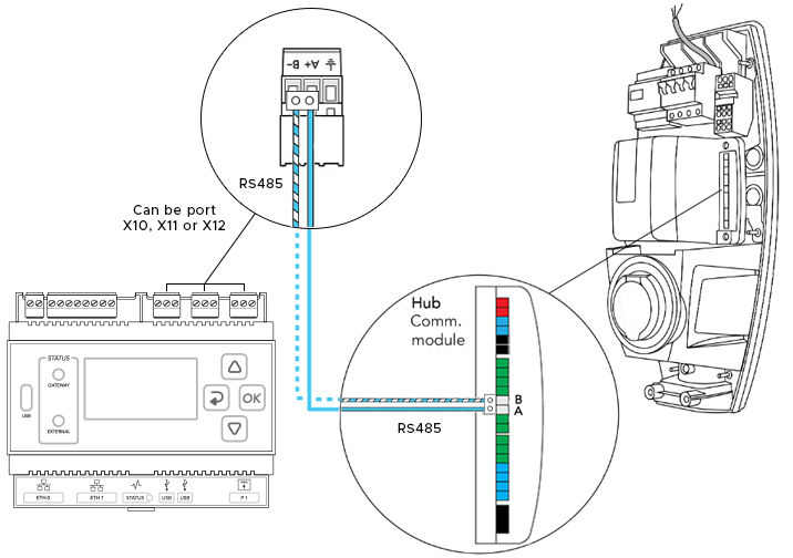 De RS485-kabel moet worden aangesloten op de RS485-poort op elke G4 HUB zoals getoond in de onderstaande afbeelding.