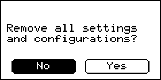 Voert een fabrieksreset van het apparaat uit. Wees ervan bewust dat dit proces alle gebruikersinstellingen en configuraties verwijdert, waardoor het apparaat in de oorspronkelijke staat wordt teruggebracht. Het apparaat vraagt twee keer om bevestiging.