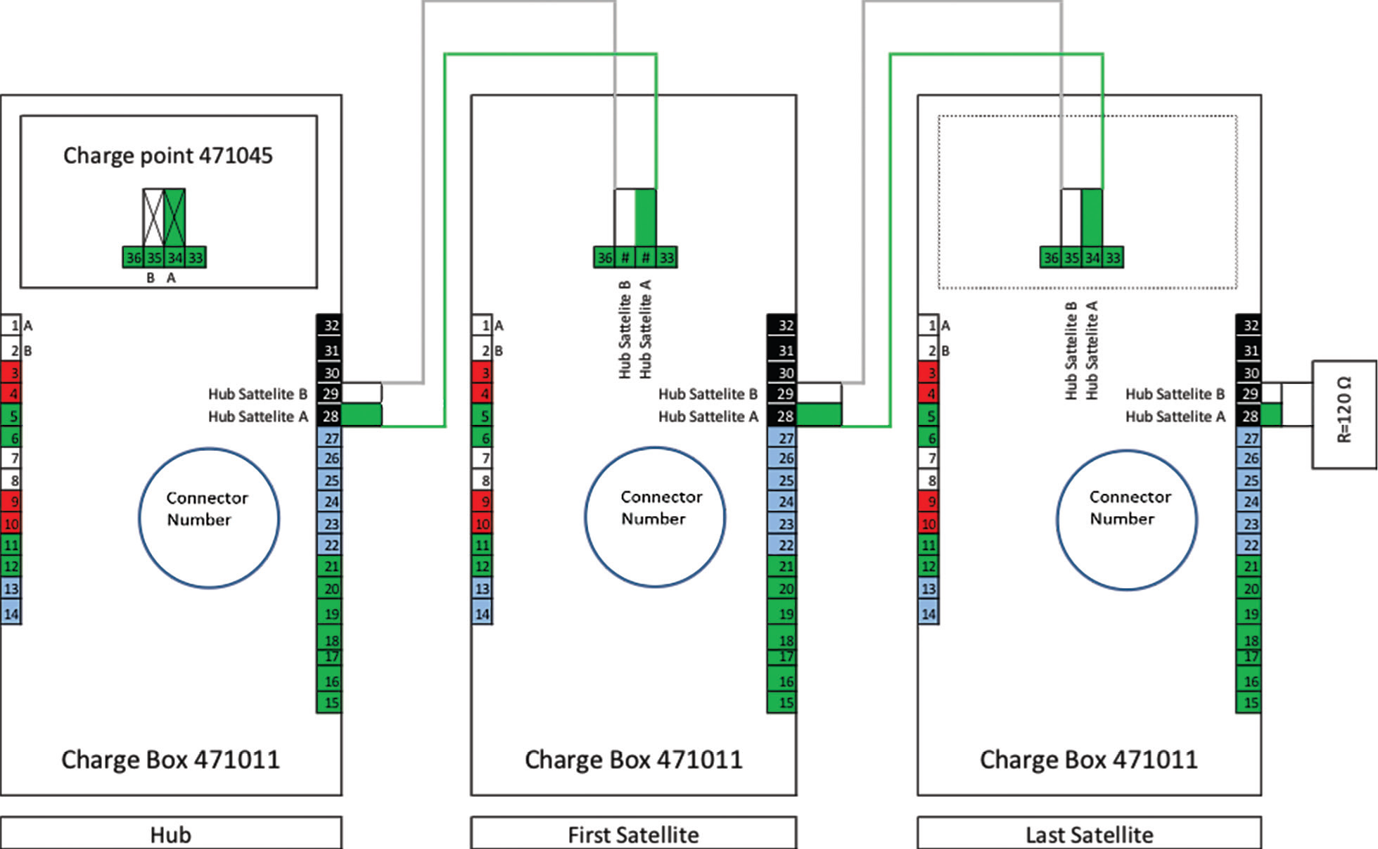 To connect the G4, install an RS485 cable from the Embion EMS Controller to the RS485 port on the G4 HUB(s). The G4 Satellites should be connected to the G4 HUB following the instructions provided by EVBox.