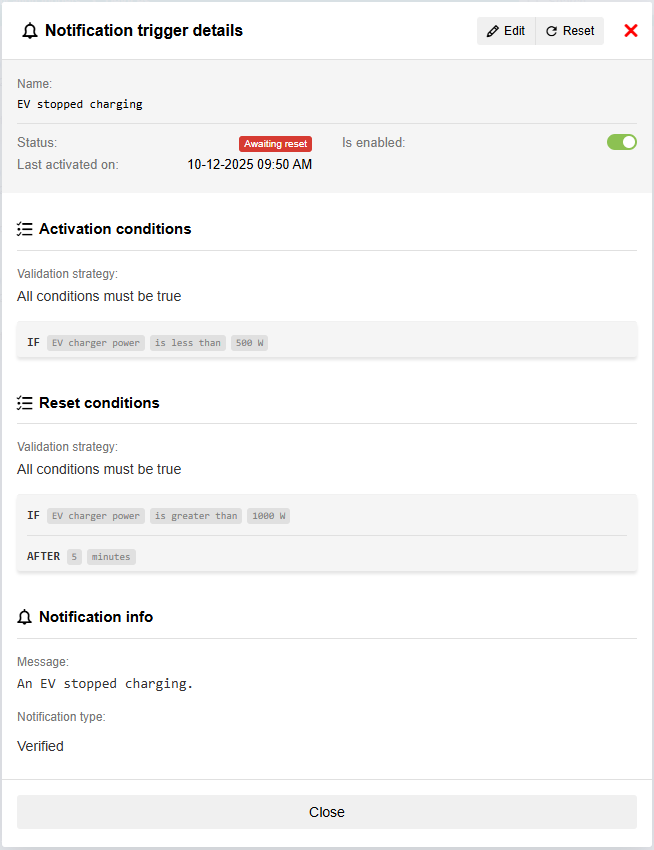 This two-phase approach prevents repeated notifications for the same ongoing condition. For example, if you set a trigger for when battery state of charge drops below 20%, the trigger will only send one notification when the condition is first met, then wait for the reset conditions (e.g., battery state of charge rises above 50%) before it can trigger again.