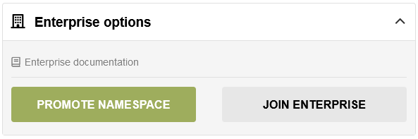 Nadat een namespace is gepromoveerd naar enterprise, wordt de enterprise nu weergegeven binnen de namespace-selector. Gebruikers kunnen de enterprise openen door op het ‘open’-symbool te drukken.