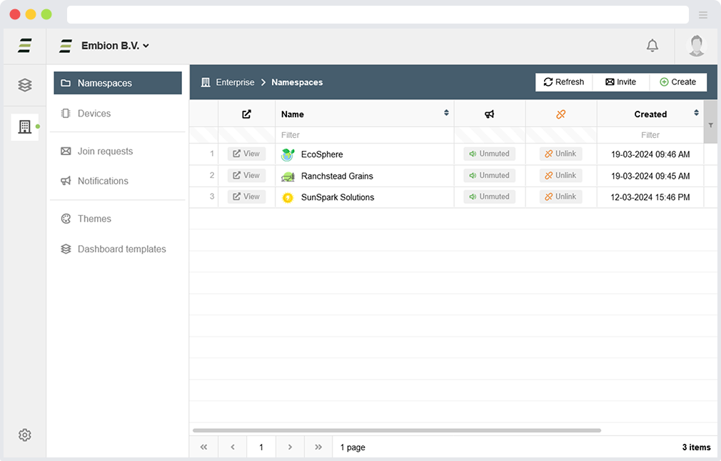 Op de apparatenpagina kunnen gebruikers alle verbonden apparaten bekijken binnen namespaces die aan de enterprise zijn gekoppeld. Hier wordt diverse informatie over de apparaten weergegeven.