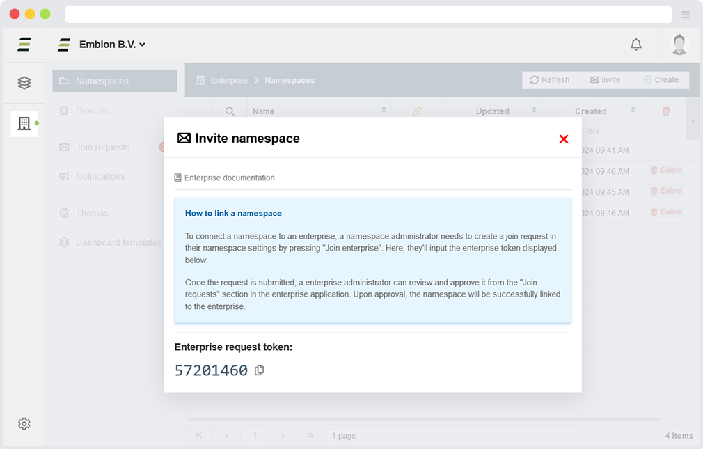 Voor enterprise-gebruikers is het niet mogelijk om bestaande namespaces direct aan de enterprise toe te voegen. In plaats daarvan moet een gebruiker binnen de namespace een toetredingsverzoek aanmaken. Hiervoor is een token nodig, deze kan worden gevonden door op de uitnodigingsknop in het namespaces overzicht te drukken. Het token kan ook binnen de enterprise-gegevens in de instellingenapplicatie gevonden worden.