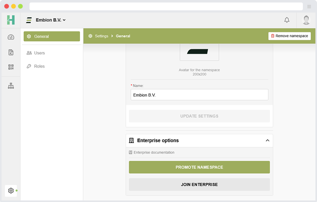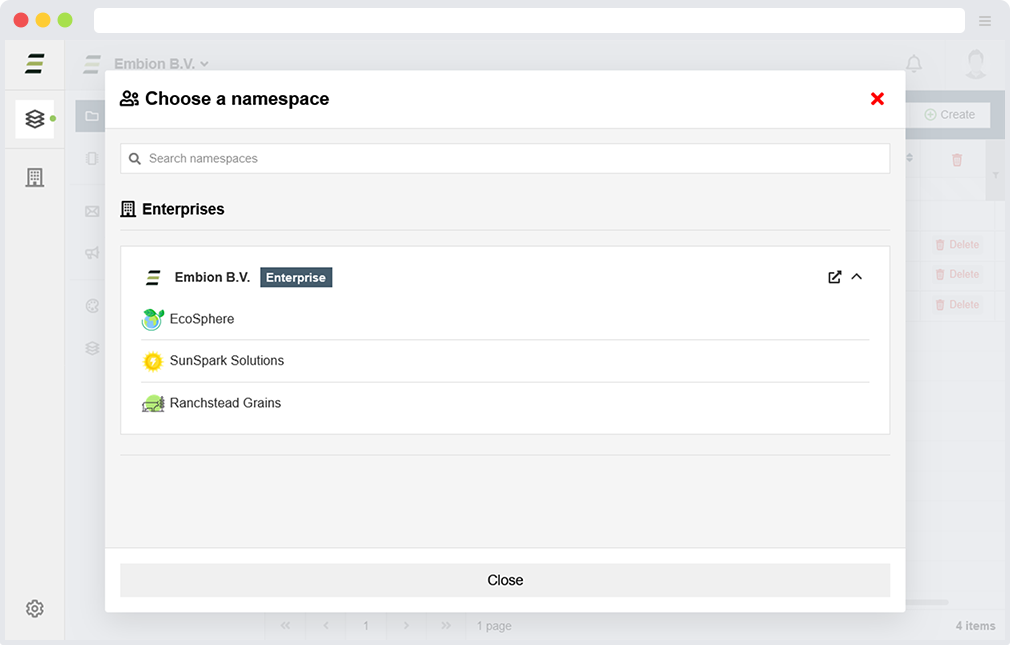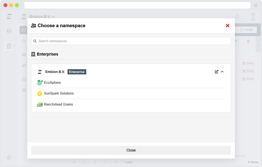 Op de namespaces-pagina is het mogelijk om alle verbonden namespaces te beheren. Het is ook mogelijk om hier een nieuwe namespaces te creëren die direct aan de enterprise zijn gekoppeld, zodat deze kunnen worden ingesteld voordat eindgebruikers worden uitgenodigd.