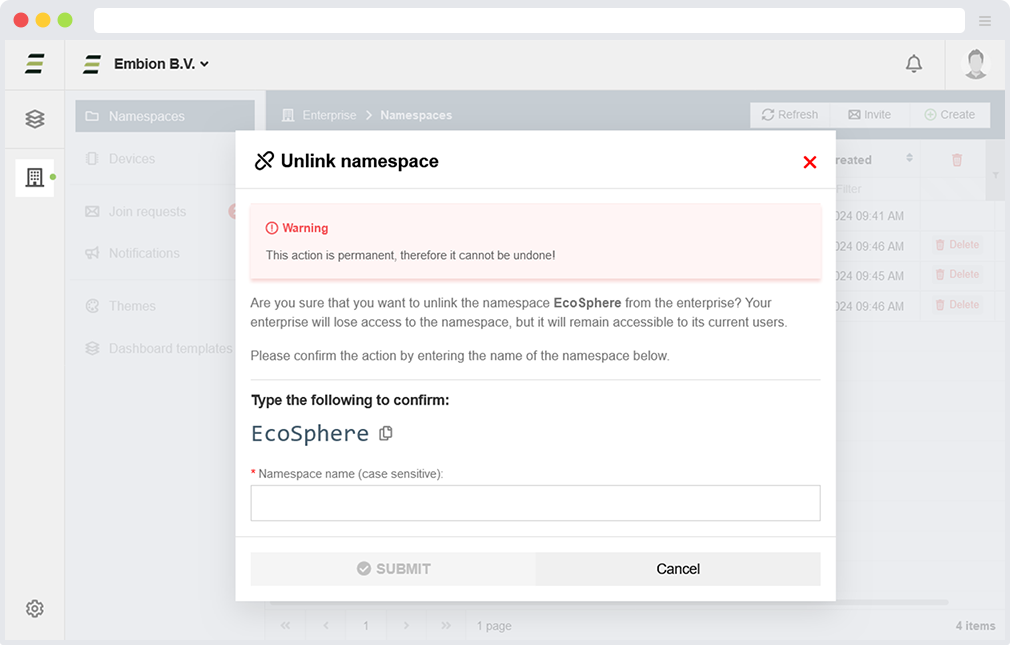 Het is mogelijk om een namespace los te koppelen van de enterprise, wat resulteert in het verlies van rechten om deze te beheren. De namespace blijft echter bestaan met de huidige gebruikers.