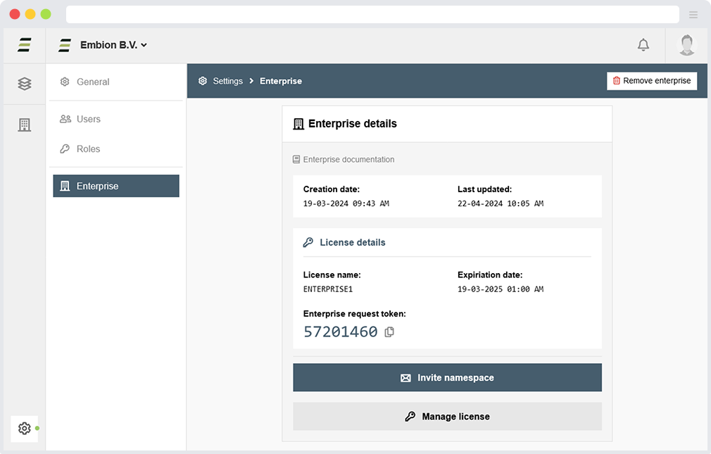 Nadat een namespace is gepromoveerd naar enterprise, wordt er een nieuwe ‘Enterprise’-pagina toegevoegd aan de instellingenapplicatie. Hier kunnen gebruikers de details van de actieve licentie vinden en deze indien nodig beheren. Daarnaast kan hier de enterprise-token worden gevonden, die kan worden verstrekt aan gebruikers om een toetredingsverzoek voor de enterprise in te dienen.