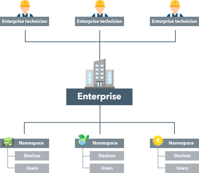 Enterprise wordt voornamelijk gebruikt om een groot aantal apparaten in de HUB te beheren en te monitoren, en om aangepaste HUB themas toe te staan voor namespaces die lid zijn van een enterprise.