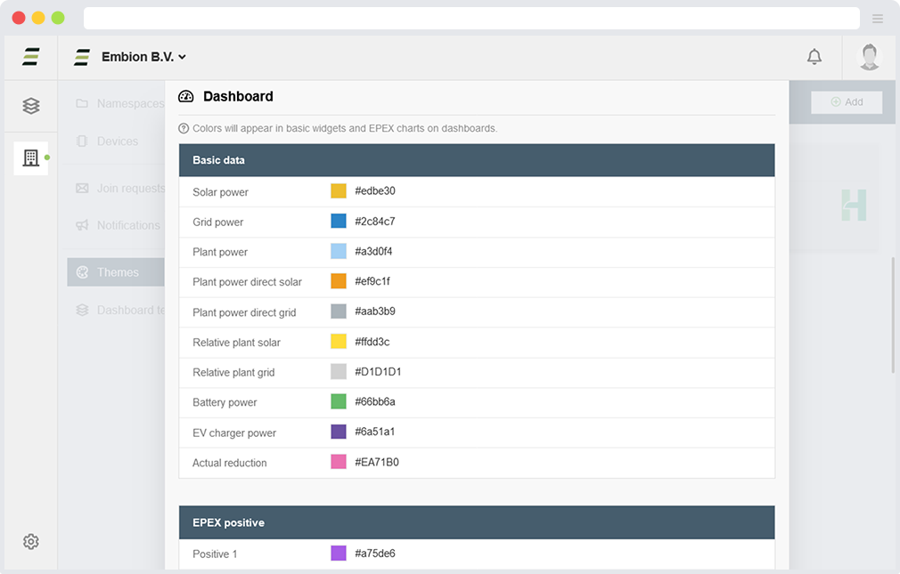 Kleuren voor de gegevens binnen EPEX-widgets op dashboards kunnen worden ingesteld. Er zijn vier sets, waarbij positief 1 overeenkomt met negatief 1, enzovoort.
