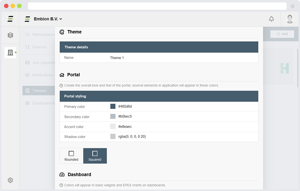 Bij het creëren van een thema kunnen verschillende kleuren worden aangepast om de algehele uitstraling op het HUB-platform te wijzigen. Voor nu kunnen deze kleuren en instellingen worden gedefinieerd binnen de portal-sectie van het thema.
