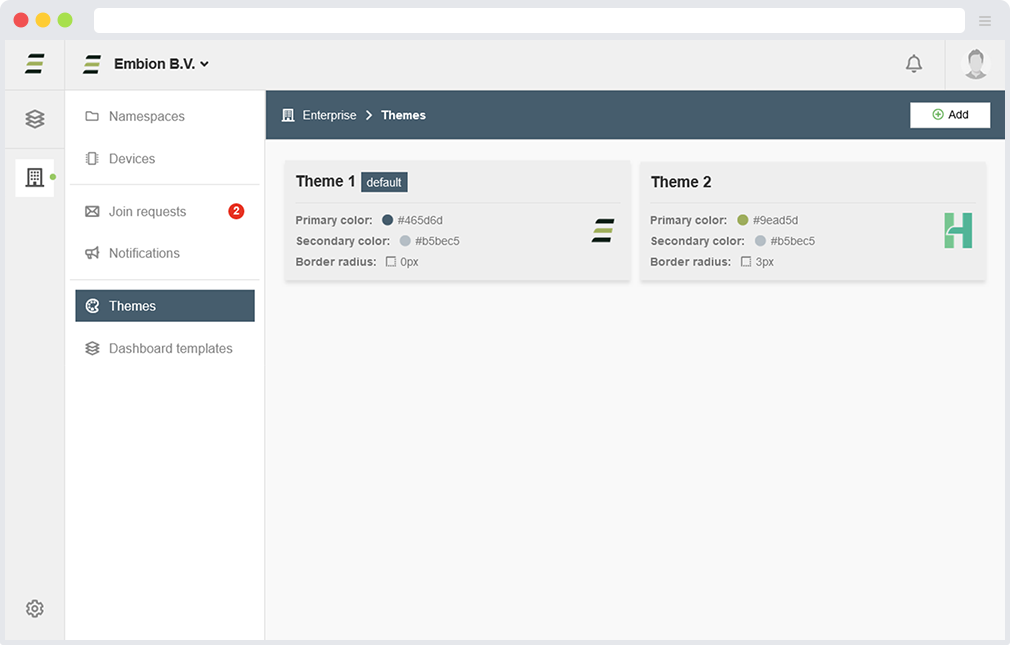 Enterprises beschikken over de functie om aangepaste thema’s te creëren, wat de visuele ervaring voor gebruikers binnen namespaces van de enterprise verbetert. Deze thema’s kunnen worden gemaakt met de kleuren en logo’s van het bedrijf, waardoor een consistente organisatie-uitstraling wordt gegarandeerd voor alle namespaces die aan de enterprise zijn gekoppeld.