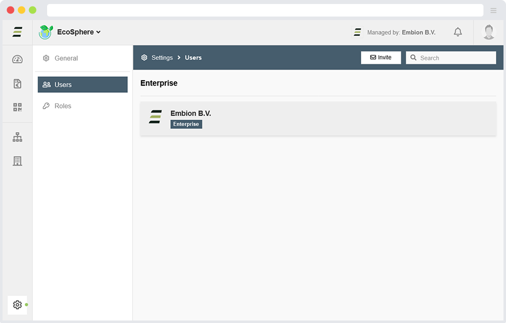 De gebruikerspagina toont alle gebruikers binnen de enterprise. Nieuwe of bestaande gebruikers van de HUB kunnen worden toegevoegd door op de uitnodigingsknop te drukken. Door op een activie gebruiker van de enterprise te drukken, kunnen rollen worden toegewezen.